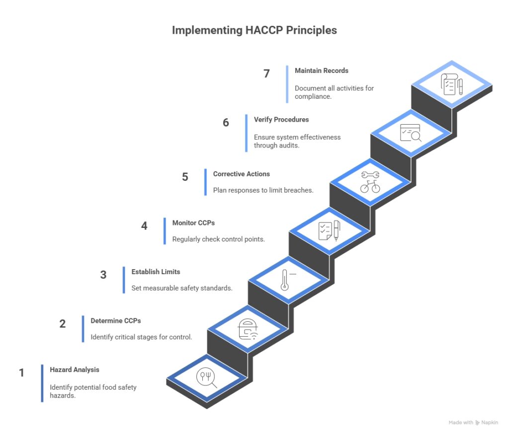 - Establish Critical Limits – Set measurable standards like minimum cooking temperatures.