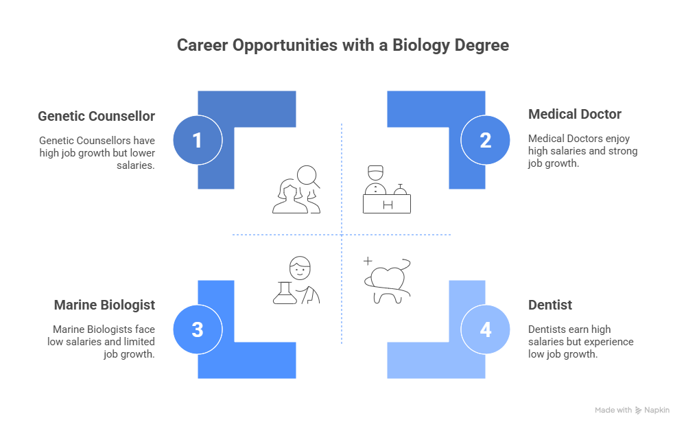 Moreover, biology graduates can transition into various fields, including business, management, law, and education, thereby expanding their opportunities and salary range further. With options for postgraduate specialisations (MSc, PhD) or cross-disciplinary credentials (e.g., MBA), biology continues to be a future-proof degree—ideal for anyone looking to combine passion, purpose, and a high income.